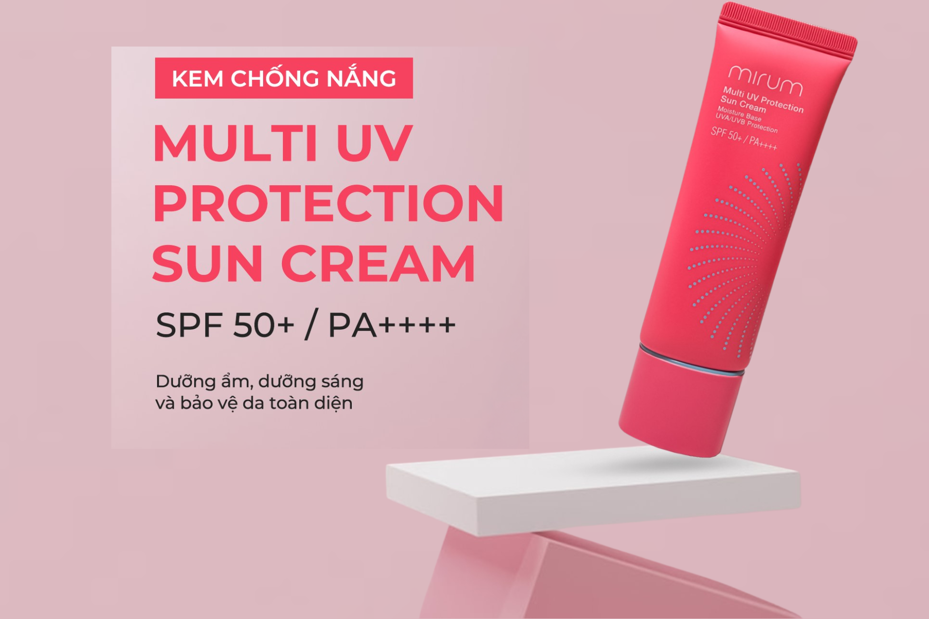 Kem chống nắng Mirum Multi UV Protection Sun Cream SPF50+/PA++++, với thành phần nổi từ Titanium Dioxide, Ethyhexyl Methoxycinamate, ….