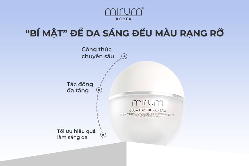 - Da không đều màu, nám nhẹ: Mirum Glow Synergy Cream – với các thành phần nổi bật là Glycerim, Niacinamide và 10 loại thảo dược tự nhiên, giúp cải thiện sắc tố, làm sáng da tự nhiên và hỗ trợ đều màu da chỉ sau vài tuần sử dụng.